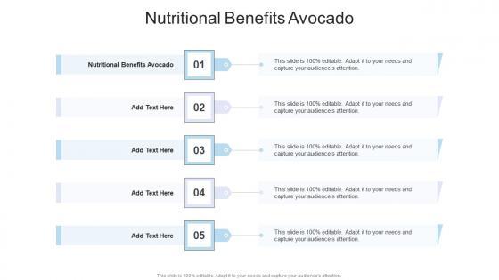 Presenting our innovatively designed set of slides titled Nutritional Benefits Avocado In Powerpoint And Google Slides Cpb. This completely editable PowerPoint graphic exhibits Nutritional Benefits Avocado that will help you convey the message impactfully. It can be accessed with Google Slides and is available in both standard screen and widescreen aspect ratios. Apart from this, you can download this well-structured PowerPoint template design in different formats like PDF, JPG, and PNG. So, click the download button now to gain full access to this PPT design. Our Nutritional Benefits Avocado In Powerpoint And Google Slides Cpb are topically designed to provide an attractive backdrop to any subject. Use them to look like a presentation pro.