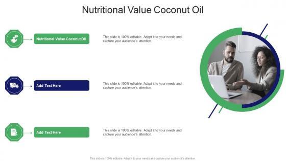 Introducing our well designed Nutritional Value Coconut Oil In Powerpoint And Google Slides Cpb. This PowerPoint design presents information on topics like Nutritional Value Coconut Oil. As it is predesigned it helps boost your confidence level. It also makes you a better presenter because of its high-quality content and graphics. This PPT layout can be downloaded and used in different formats like PDF, PNG, and JPG. Not only this, it is available in both Standard Screen and Widescreen aspect ratios for your convenience. Therefore, click on the download button now to persuade and impress your audience. Our Nutritional Value Coconut Oil In Powerpoint And Google Slides Cpb are topically designed to provide an attractive backdrop to any subject. Use them to look like a presentation pro.