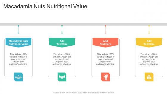 Introducing our well-designed Macadamia Nuts Nutritional Value In Powerpoint And Google Slides Cpb. This PowerPoint design presents information on topics like Macadamia Nuts Nutritional Value. As it is predesigned it helps boost your confidence level. It also makes you a better presenter because of its high-quality content and graphics. This PPT layout can be downloaded and used in different formats like PDF, PNG, and JPG. Not only this, it is available in both Standard Screen and Widescreen aspect ratios for your convenience. Therefore, click on the download button now to persuade and impress your audience. Our Macadamia Nuts Nutritional Value In Powerpoint And Google Slides Cpb are topically designed to provide an attractive backdrop to any subject. Use them to look like a presentation pro.