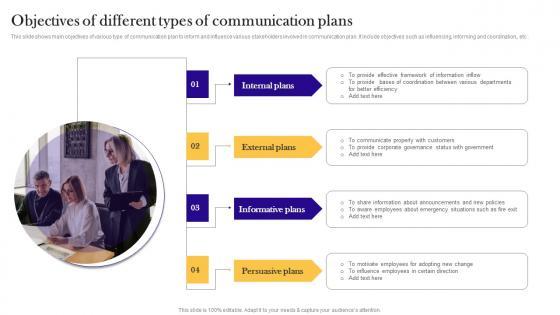 This slide shows main objectives of various type of communication plan to inform and influence various stakeholders involved in communication plan. It include objectives such as influencing, informing and coordination,, etc.. Pitch your topic with ease and precision using this Objectives Of Different Types Of Communication Plans Guidelines Pdf. This layout presents information on Internal Plans, External Plans, Informative Plans. It is also available for immediate download and adjustment. So, changes can be made in the color, design, graphics or any other component to create a unique layout. This slide shows main objectives of various type of communication plan to inform and influence various stakeholders involved in communication plan. It include objectives such as influencing, informing and coordination,, etc..