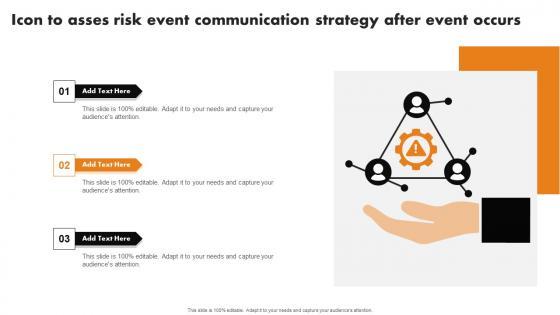 Pitch your topic with ease and precision using this Icon To Asses Risk Event Communication Strategy After Event Occurs Ideas Pdf This layout presents information on Icon To Asses, Risk Event Communication, Strategy After Event Occurs It is also available for immediate download and adjustment. So, changes can be made in the color, design, graphics or any other component to create a unique layout. Our Icon To Asses Risk Event Communication Strategy After Event Occurs Ideas Pdf are topically designed to provide an attractive backdrop to any subject. Use them to look like a presentation pro.