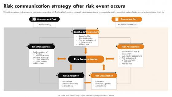 This slide showcases strategies used by organizations for avoiding risk. This template focuses on giving early warning about disaster risk in particular area. It includes information related to assessment, visualization of risk, etc.Pitch your topic with ease and precision using this Risk Communication Strategy After Risk Event Occurs Download Pdf This layout presents information on Risk Management, Stakeholder Involvement, Risk Communication It is also available for immediate download and adjustment. So, changes can be made in the color, design, graphics or any other component to create a unique layout. This slide showcases strategies used by organizations for avoiding risk. This template focuses on giving early warning about disaster risk in particular area. It includes information related to assessment, visualization of risk, etc.