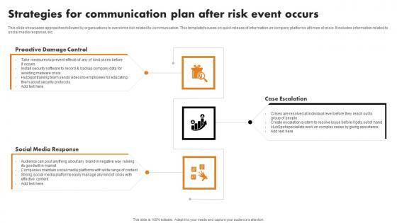 This slide showcases approaches followed by organizations to overcome risk related to communication. This template focuses on quick release of information on company platforms at times of crisis. It includes information related to social media response, etc.Showcasing this set of slides titled Strategies For Communication Plan After Risk Event Occurs Portrait Pdf The topics addressed in these templates are Proactive Damage Control, Social Media Response, Case Escalation All the content presented in this PPT design is completely editable. Download it and make adjustments in color, background, font etc. as per your unique business setting. This slide showcases approaches followed by organizations to overcome risk related to communication. This template focuses on quick release of information on company platforms at times of crisis. It includes information related to social media response, etc.