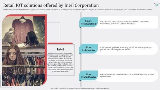 The following slide highlights the technology solutions provided by Intel corporation for enabling retailers to implement internet of things in retail sector. It shows smart retail analytics, store aisle monitor and store traffic monitor Are you in need of a template that can accommodate all of your creative concepts This one is crafted professionally and can be altered to fit any style. Use it with Google Slides or PowerPoint. Include striking photographs, symbols, depictions, and other visuals. Fill, move around, or remove text boxes as desired. Test out color palettes and font mixtures. Edit and save your work, or work with colleagues. Download How Industrial IoT Is Changing Worldwide Retail IoT Solutions Offered Intel Microsoft Pdf and observe how to make your presentation outstanding. Give an impeccable presentation to your group and make your presentation unforgettable. The following slide highlights the technology solutions provided by Intel corporation for enabling retailers to implement internet of things in retail sector. It shows smart retail analytics, store aisle monitor and store traffic monitor