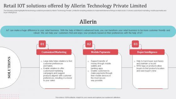 The following slide highlights the technology solutions provided by Allerin Technology Private Limited for enabling retailers to implement internet of things in retail sector. It shows customized marketing, mobile payments and buyer intelligence Explore a selection of the finest Retail IoT Solutions Offered Allerin How Industrial IoT Is Changing Worldwide Themes Pdf here. With a plethora of professionally designed and pre made slide templates, you can quickly and easily find the right one for your upcoming presentation. You can use our Retail IoT Solutions Offered Allerin How Industrial IoT Is Changing Worldwide Themes Pdf to effectively convey your message to a wider audience. Slidegeeks has done a lot of research before preparing these presentation templates. The content can be personalized and the slides are highly editable. Grab templates today from Slidegeeks. The following slide highlights the technology solutions provided by Allerin Technology Private Limited for enabling retailers to implement internet of things in retail sector. It shows customized marketing, mobile payments and buyer intelligence