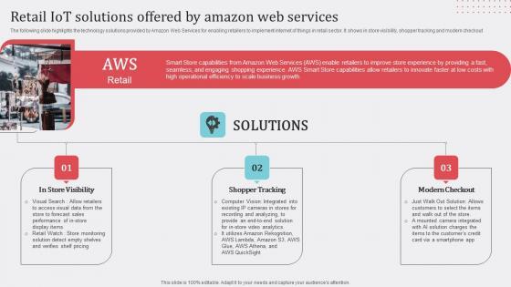 The following slide highlights the technology solutions provided by Amazon Web Services for enabling retailers to implement internet of things in retail sector. It shows in store visibility, shopper tracking and modern checkout The best PPT templates are a great way to save time, energy, and resources. Slidegeeks have 100 percent editable powerpoint slides making them incredibly versatile. With these quality presentation templates, you can create a captivating and memorable presentation by combining visually appealing slides and effectively communicating your message. Download Retail IoT Solutions Offered Amazon How Industrial IoT Is Changing Worldwide Microsoft Pdf from Slidegeeks and deliver a wonderful presentation. The following slide highlights the technology solutions provided by Amazon Web Services for enabling retailers to implement internet of things in retail sector. It shows in store visibility, shopper tracking and modern checkout