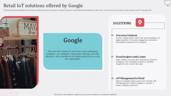 The following slide highlights the technology solutions provided by Google for enabling retailers to implement internet of things in retail sector. It shows discovery solutions, retail analytics and API management The Retail IoT Solutions Offered By How Industrial IoT Is Changing Worldwide Designs Pdf is a compilation of the most recent design trends as a series of slides. It is suitable for any subject or industry presentation, containing attractive visuals and photo spots for businesses to clearly express their messages. This template contains a variety of slides for the user to input data, such as structures to contrast two elements, bullet points, and slides for written information. Slidegeeks is prepared to create an impression. The following slide highlights the technology solutions provided by Google for enabling retailers to implement internet of things in retail sector. It shows discovery solutions, retail analytics and API management