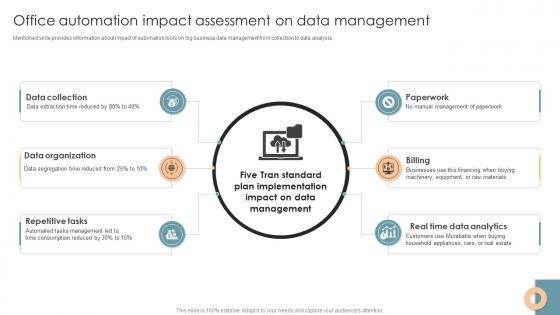 Mentioned slide provides information about impact of automation tools on big business data management from collection to data analysis.This Office Automation Impact Assessment On Data Office Process Optimization To Increase Cost Efficiency is perfect for any presentation, be it in front of clients or colleagues. It is a versatile and stylish solution for organizing your meetings. The Office Automation Impact Assessment On Data Office Process Optimization To Increase Cost Efficiency features a modern design for your presentation meetings. The adjustable and customizable slides provide unlimited possibilities for acing up your presentation. Slidegeeks has done all the homework before launching the product for you. So, do not wait, grab the presentation templates today Mentioned slide provides information about impact of automation tools on big business data management from collection to data analysis.