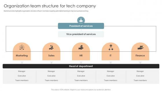 Mentioned slide highlights organization structure of team members requiring automation training to improve business working.The best PPT templates are a great way to save time, energy, and resources. Slidegeeks have 100 percent editable powerpoint slides making them incredibly versatile. With these quality presentation templates, you can create a captivating and memorable presentation by combining visually appealing slides and effectively communicating your message. Download Organization Team Structure For Tech Company Office Process Optimization To Increase Cost Efficiency from Slidegeeks and deliver a wonderful presentation. Mentioned slide highlights organization structure of team members requiring automation training to improve business working.