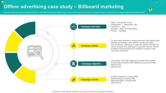 This slide showcases billboard advertisement case study which helped organization to gain new customers. Its key elements are company overview, campaign goal, campaign details and campaign results. Retrieve professionally designed One On One Advertising Offline Advertising Case Study Billboard Marketing Strategy SS V to effectively convey your message and captivate your listeners. Save time by selecting pre-made slideshows that are appropriate for various topics, from business to educational purposes. These themes come in many different styles, from creative to corporate, and all of them are easily adjustable and can be edited quickly. Access them as PowerPoint templates or as Google Slides themes. You do not have to go on a hunt for the perfect presentation because Slidegeeks got you covered from everywhere. This slide showcases billboard advertisement case study which helped organization to gain new customers. Its key elements are company overview, campaign goal, campaign details and campaign results.