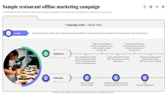 This slide represents offline marketing campaign sample for family-style restaurant. It covers details such as campaign name, goals, initiatives, and outcomes. Create an editable Sample Restaurant Offline Marketing Campaign Strategic Guide To Launching Ppt Powerpoint that communicates your idea and engages your audience. Whether you are presenting a business or an educational presentation, pre-designed presentation templates help save time. Sample Restaurant Offline Marketing Campaign Strategic Guide To Launching Ppt Powerpoint is highly customizable and very easy to edit, covering many different styles from creative to business presentations. Slidegeeks has creative team members who have crafted amazing templates. So, go and get them without any delay. This slide represents offline marketing campaign sample for family-style restaurant. It covers details such as campaign name, goals, initiatives, and outcomes.