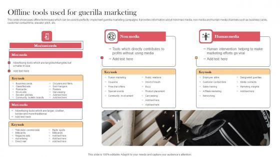 This slide showcases offline techniques which can be used to perfectly implement guerilla marketing campaigns. It provides information about minimaxi media, non media and human media channels such as business cards, customer contact time, elevator pitch, etc. Welcome to our selection of the Strategic Guide To Attract Offline Tools Used For Guerilla Marketing Template Pdf. These are designed to help you showcase your creativity and bring your sphere to life. Planning and Innovation are essential for any business that is just starting out. This collection contains the designs that you need for your everyday presentations. All of our PowerPoints are 100 percent editable, so you can customize them to suit your needs. This multi-purpose template can be used in various situations. Grab these presentation templates today. This slide showcases offline techniques which can be used to perfectly implement guerilla marketing campaigns. It provides information about minimaxi media, non media and human media channels such as business cards, customer contact time, elevator pitch, etc.