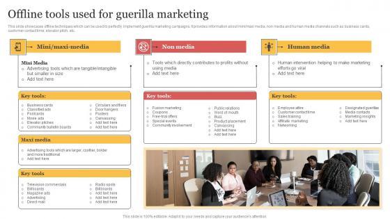 This slide showcases offline techniques which can be used to perfectly implement guerilla marketing campaigns. It provides information about mini maxi media, non media and human media channels such as business cards, customer contact time, elevator pitch, etc. Coming up with a presentation necessitates that the majority of the effort goes into the content and the message you intend to convey. The visuals of a PowerPoint presentation can only be effective if it supplements and supports the story that is being told. Keeping this in mind our experts created Offline Tools Used For Guerilla Marketing Organizing Buzzworthy Social Introduction Pdf to reduce the time that goes into designing the presentation. This way, you can concentrate on the message while our designers take care of providing you with the right template for the situation. This slide showcases offline techniques which can be used to perfectly implement guerilla marketing campaigns. It provides information about mini maxi media, non media and human media channels such as business cards, customer contact time, elevator pitch, etc.
