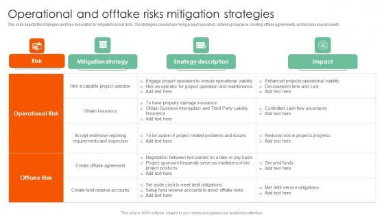 This slide depicts the strategies and their description to mitigate financial risks. The strategies covered are hiring project operators, obtaining insurance, creating offtake agreements, and fund reserve accounts. Are you in need of a template that can accommodate all of your creative concepts This one is crafted professionally and can be altered to fit any style. Use it with Google Slides or PowerPoint. Include striking photographs, symbols, depictions, and other visuals. Fill, move around, or remove text boxes as desired. Test out color palettes and font mixtures. Edit and save your work, or work with colleagues. Download Operational And Offtake Risks Complete Guide On How To Mitigate Infographics Pdf and observe how to make your presentation outstanding. Give an impeccable presentation to your group and make your presentation unforgettable. This slide depicts the strategies and their description to mitigate financial risks. The strategies covered are hiring project operators, obtaining insurance, creating offtake agreements, and fund reserve accounts.