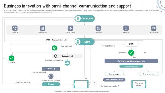 This slide presents the workflow of omni-channel communication and support that helps in providing a seamless and integrated customer experience across multiple communication channels. It include communication channels such as email, social media, live chat, phone and mobile applications.From laying roadmaps to briefing everything in detail, our templates are perfect for you. You can set the stage with your presentation slides. All you have to do is download these easy-to-edit and customizable templates. Business Innovation With Omni Channel Communication And Support DT SS V will help you deliver an outstanding performance that everyone would remember and praise you for. Do download this presentation today. This slide presents the workflow of omni-channel communication and support that helps in providing a seamless and integrated customer experience across multiple communication channels. It include communication channels such as email, social media, live chat, phone and mobile applications.
