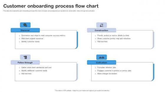 This slide showcases the user onboarding process flow chart. It include various aspects such as discover, construction, follow through and cultivation. Pitch your topic with ease and precision using this Customer Onboarding Process Flow Chart Information Pdf. This layout presents information on Discover, Follow Through, Cultivation. It is also available for immediate download and adjustment. So, changes can be made in the color, design, graphics or any other component to create a unique layout. This slide showcases the user onboarding process flow chart. It include various aspects such as discover, construction, follow through and cultivation.