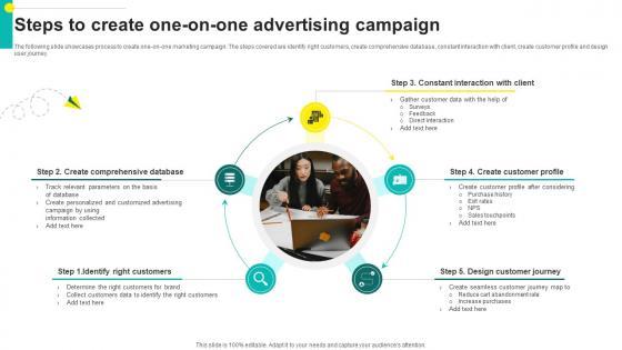 The following slide showcases process to create one-on-one marketing campaign. The steps covered are identify right customers, create comprehensive database, constant interaction with client, create customer profile and design user journey. Whether you have daily or monthly meetings, a brilliant presentation is necessary. Steps To Create One On One Advertising Campaign Guidelines PDF can be your best option for delivering a presentation. Represent everything in detail using Steps To Create One On One Advertising Campaign Guidelines PDF and make yourself stand out in meetings. The template is versatile and follows a structure that will cater to your requirements. All the templates prepared by Slidegeeks are easy to download and edit. Our research experts have taken care of the corporate themes as well. So, give it a try and see the results.