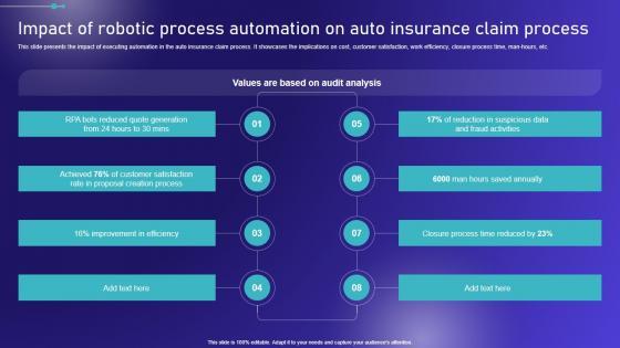 This slide presents the impact of executing automation in the auto insurance claim process. It showcases the implications on cost, customer satisfaction, work efficiency, closure process time, man-hours, etc. Here you can discover an assortment of the finest PowerPoint and Google Slides templates. With these templates, you can create presentations for a variety of purposes while simultaneously providing your audience with an eye-catching visual experience. Download Impact Of Robotic Process Automation On Auto Embracing Robotic Process Structure PDF to deliver an impeccable presentation. These templates will make your job of preparing presentations much quicker, yet still, maintain a high level of quality. Slidegeeks has experienced researchers who prepare these templates and write high-quality content for you. Later on, you can personalize the content by editing the Impact Of Robotic Process Automation On Auto Embracing Robotic Process Structure PDF. This slide presents the impact of executing automation in the auto insurance claim process. It showcases the implications on cost, customer satisfaction, work efficiency, closure process time, man-hours, etc.