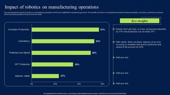 This slide depicts the impact of robotics on manufacturing operations, which has simplified the manufacturing process. The benefits of robotics to manufacturing include increased productivity, consistency, perfection and speed, enhanced product quality and improved worker safety. Retrieve professionally designed Iot Integration In Manufacturing Impact Of Robotics On Manufacturing Operations Sample PDF to effectively convey your message and captivate your listeners. Save time by selecting pre-made slideshows that are appropriate for various topics, from business to educational purposes. These themes come in many different styles, from creative to corporate, and all of them are easily adjustable and can be edited quickly. Access them as PowerPoint templates or as Google Slides themes. You do not have to go on a hunt for the perfect presentation because Slidegeeks got you covered from everywhere.