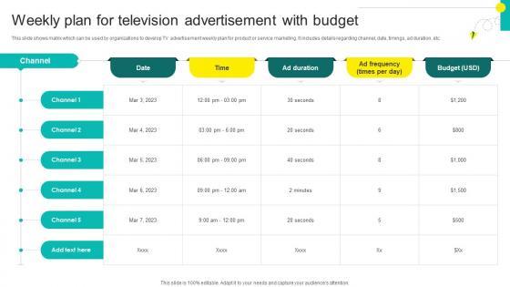 This slide shows matrix which can be used by organizations to develop TV advertisement weekly plan for product or service marketing. It includes details regarding channel, date, timings, ad duration, etc. From laying roadmaps to briefing everything in detail, our templates are perfect for you. You can set the stage with your presentation slides. All you have to do is download these easy-to-edit and customizable templates. One On One Advertising Weekly Plan For Television Advertisement With Budget Strategy SS V will help you deliver an outstanding performance that everyone would remember and praise you for. Do download this presentation today. This slide shows matrix which can be used by organizations to develop TV advertisement weekly plan for product or service marketing. It includes details regarding channel, date, timings, ad duration, etc.