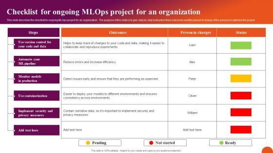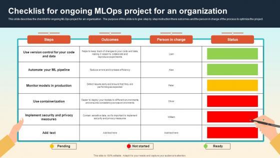 This slide describes the checklist for ongoing MLOps project for an organization . The purpose of this slide is to give step by step instruction there outcomes and the person in charge of the process to optimize the project. If your project calls for a presentation, then Slidegeeks is your go-to partner because we have professionally designed, easy-to-edit templates that are perfect for any presentation. After downloading, you can easily edit Checklist For Ongoing MLOPs Project For An Organization Introduction To MLOPs IT and make the changes accordingly. You can rearrange slides or fill them with different images. Check out all the handy templates This slide describes the checklist for ongoing MLOps project for an organization . The purpose of this slide is to give step by step instruction there outcomes and the person in charge of the process to optimize the project.