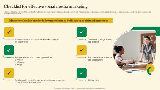 Following slide shows checklist that provide information about important factors to be considered by marketers to increase social media presence. It include pointers such as research, analyse customer content preferences, develop quality content etc. Here you can discover an assortment of the finest PowerPoint and Google Slides templates. With these templates, you can create presentations for a variety of purposes while simultaneously providing your audience with an eye-catching visual experience. Download Checklist For Effective Social Media Marketing Online Customer Acquisition Graphics Pdf to deliver an impeccable presentation. These templates will make your job of preparing presentations much quicker, yet still, maintain a high level of quality. Slidegeeks has experienced researchers who prepare these templates and write high-quality content for you. Later on, you can personalize the content by editing the Checklist For Effective Social Media Marketing Online Customer Acquisition Graphics Pdf Following slide shows checklist that provide information about important factors to be considered by marketers to increase social media presence. It include pointers such as research, analyse customer content preferences, develop quality content etc.