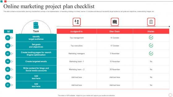 This slide contains a social media planning checklist that will help in the implementation of marketing strategy in a timely manner. It includes activities such as identify target audience, set goals and objectives, create landing images, etc. Showcasing this set of slides titled Online Marketing Project Plan Checklist Mockup Pdf. The topics addressed in these templates are Online Marketing, Project Plan Checklist, Target Audience. All the content presented in this PPT design is completely editable. Download it and make adjustments in color, background, font etc. as per your unique business setting. This slide contains a social media planning checklist that will help in the implementation of marketing strategy in a timely manner. It includes activities such as identify target audience, set goals and objectives, create landing images, etc.