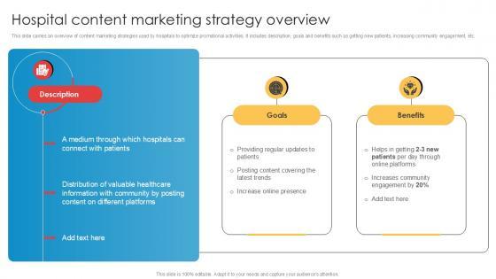This slide carries an overview of content marketing strategies used by hospitals to optimize promotional activities. It includes description, goals and benefits such as getting new patients, increasing community engagement, etc. Are you in need of a template that can accommodate all of your creative concepts This one is crafted professionally and can be altered to fit any style. Use it with Google Slides or PowerPoint. Include striking photographs, symbols, depictions, and other visuals. Fill, move around, or remove text boxes as desired. Test out color palettes and font mixtures. Edit and save your work, or work with colleagues. Download Hospital Content Marketing Strategy Overview Implementation Of Online Ppt Template and observe how to make your presentation outstanding. Give an impeccable presentation to your group and make your presentation unforgettable. This slide carries an overview of content marketing strategies used by hospitals to optimize promotional activities. It includes description, goals and benefits such as getting new patients, increasing community engagement, etc.