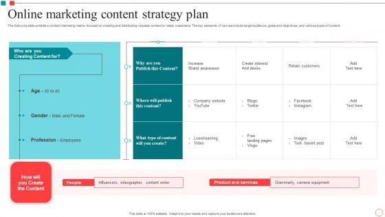 The following slide exhibits a content marketing matrix focused on creating and distributing valuable content to retain customers. The key elements of canvas include target audience, goals and objectives, and various types of content. Showcasing this set of slides titled Online Marketing Content Strategy Plan Topics Pdf. The topics addressed in these templates are Online Marketing, Content Strategy Plan, Target Audience. All the content presented in this PPT design is completely editable. Download it and make adjustments in color, background, font etc. as per your unique business setting. The following slide exhibits a content marketing matrix focused on creating and distributing valuable content to retain customers. The key elements of canvas include target audience, goals and objectives, and various types of content.