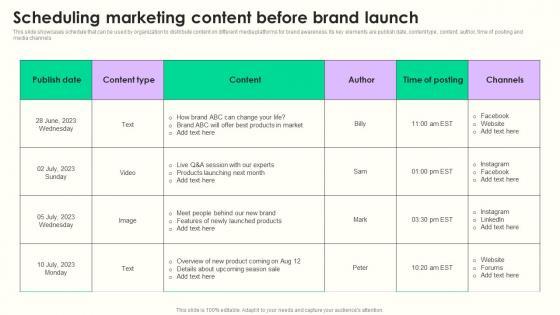 This slide showcases schedule that can be used by organization to distribute content on different media platforms for brand awareness. Its key elements are publish date, content type, content, author, time of posting and media channels Are you searching for a Scheduling Marketing Content Maximizing Sales Via Online Brand Marketing Strategies Summary Pdf that is uncluttered, straightforward, and original Its easy to edit, and you can change the colors to suit your personal or business branding. For a presentation that expresses how much effort you have put in, this template is ideal With all of its features, including tables, diagrams, statistics, and lists, its perfect for a business plan presentation. Make your ideas more appealing with these professional slides. Download Scheduling Marketing Content Maximizing Sales Via Online Brand Marketing Strategies Summary Pdf from Slidegeeks today. This slide showcases schedule that can be used by organization to distribute content on different media platforms for brand awareness. Its key elements are publish date, content type, content, author, time of posting and media channels
