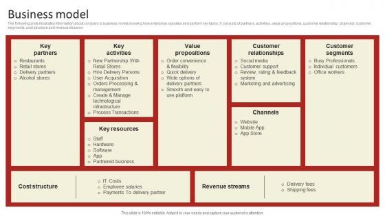 The following slide illustrates information about companys business model showing how enterprise operates and perform key tasks. It consists of partners, activities, value propositions, customer relationship, channels, customer segments, cost structure and revenue streams. Do you have to make sure that everyone on your team knows about any specific topic I yes, then you should give Business Model Online Delivery Investment Funding Elevator Pitch Deck Pictures Pdf a try. Our experts have put a lot of knowledge and effort into creating this impeccable Business Model Online Delivery Investment Funding Elevator Pitch Deck Pictures Pdf You can use this template for your upcoming presentations, as the slides are perfect to represent even the tiniest detail. You can download these templates from the Slidegeeks website and these are easy to edit. So grab these today The following slide illustrates information about companys business model showing how enterprise operates and perform key tasks. It consists of partners, activities, value propositions, customer relationship, channels, customer segments, cost structure and revenue streams.