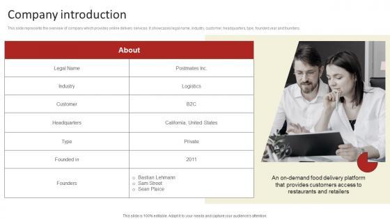 This slide represents the overview of company which provides online delivery services. It showcases legal name, industry, customer, headquarters, type, founded year and founders. From laying roadmaps to briefing everything in detail, our templates are perfect for you. You can set the stage with your presentation slides. All you have to do is download these easy to edit and customizable templates. Company Introduction Online Delivery Investment Funding Elevator Pitch Deck Infographics Pdf will help you deliver an outstanding performance that everyone would remember and praise you for. Do download this presentation today. This slide represents the overview of company which provides online delivery services. It showcases legal name, industry, customer, headquarters, type, founded year and founders.