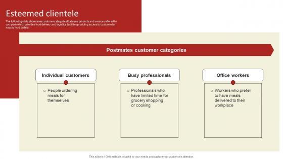 The following slide showcases customer categories that uses products and services offered by company which provides food delivery and logistics facilities providing access to customer for nearby food outlets. Whether you have daily or monthly meetings, a brilliant presentation is necessary. Esteemed Clientele Online Delivery Investment Funding Elevator Pitch Deck Background Pdf can be your best option for delivering a presentation. Represent everything in detail using Esteemed Clientele Online Delivery Investment Funding Elevator Pitch Deck Background Pdf and make yourself stand out in meetings. The template is versatile and follows a structure that will cater to your requirements. All the templates prepared by Slidegeeks are easy to download and edit. Our research experts have taken care of the corporate themes as well. So, give it a try and see the results. The following slide showcases customer categories that uses products and services offered by company which provides food delivery and logistics facilities providing access to customer for nearby food outlets.