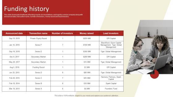 This slide showcases timeframe of funding rounds of a food delivery and logistics service company along with announced date, transaction name, number of investors, money raised and lead investors. Are you in need of a template that can accommodate all of your creative concepts This one is crafted professionally and can be altered to fit any style. Use it with Google Slides or PowerPoint. Include striking photographs, symbols, depictions, and other visuals. Fill, move around, or remove text boxes as desired. Test out color palettes and font mixtures. Edit and save your work, or work with colleagues. Download Funding History Online Delivery Investment Funding Elevator Pitch Deck Guidelines Pdf and observe how to make your presentation outstanding. Give an impeccable presentation to your group and make your presentation unforgettable. This slide showcases timeframe of funding rounds of a food delivery and logistics service company along with announced date, transaction name, number of investors, money raised and lead investors.