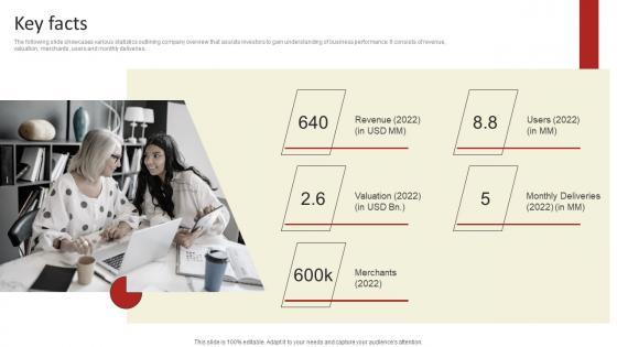 The following slide showcases various statistics outlining company overview that assists investors to gain understanding of business performance. It consists of revenue, valuation, merchants, users and monthly deliveries. Make sure to capture your audiences attention in your business displays with our gratis customizable Key Facts Online Delivery Investment Funding Elevator Pitch Deck Summary Pdf. These are great for business strategies, office conferences, capital raising or task suggestions. If you desire to acquire more customers for your tech business and ensure they stay satisfied, create your own sales presentation with these plain slides. The following slide showcases various statistics outlining company overview that assists investors to gain understanding of business performance. It consists of revenue, valuation, merchants, users and monthly deliveries.