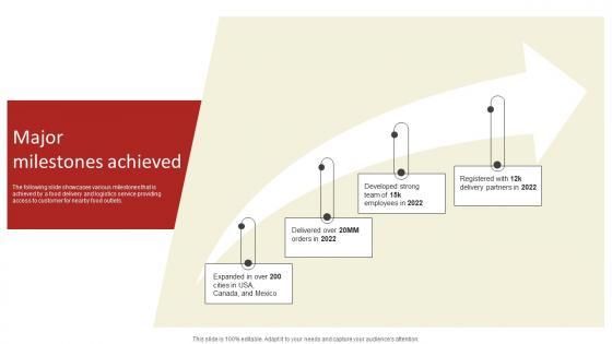 The following slide showcases various milestones that is achieved by a food delivery and logistics service providing access to customer for nearby food outlets. Formulating a presentation can take up a lot of effort and time, so the content and message should always be the primary focus. The visuals of the PowerPoint can enhance the presenters message, so our Major Milestones Achieved Online Delivery Investment Funding Elevator Pitch Deck Graphics Pdf was created to help save time. Instead of worrying about the design, the presenter can concentrate on the message while our designers work on creating the ideal templates for whatever situation is needed. Slidegeeks has experts for everything from amazing designs to valuable content, we have put everything into Major Milestones Achieved Online Delivery Investment Funding Elevator Pitch Deck Graphics Pdf The following slide showcases various milestones that is achieved by a food delivery and logistics service providing access to customer for nearby food outlets.