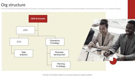 This slide showcases the organization structure of a food delivery and logistics service company providing access to customer for nearby food outlets. It consists of CEO and founder, CFO, CTO, operations and strategy. This modern and well arranged Org Structure Online Delivery Investment Funding Elevator Pitch Deck Designs Pdf provides lots of creative possibilities. It is very simple to customize and edit with the Powerpoint Software. Just drag and drop your pictures into the shapes. All facets of this template can be edited with Powerpoint, no extra software is necessary. Add your own material, put your images in the places assigned for them, adjust the colors, and then you can show your slides to the world, with an animated slide included. This slide showcases the organization structure of a food delivery and logistics service company providing access to customer for nearby food outlets. It consists of CEO and founder, CFO, CTO, operations and strategy.