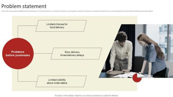 This slide showcases identified problems that are commonly faced by customers for delivery and logistics services. Problems consists of limited choices, slow delivery times and limited visibility about order status. Welcome to our selection of the Problem Statement Online Delivery Investment Funding Elevator Pitch Deck Guidelines Pdf. These are designed to help you showcase your creativity and bring your sphere to life. Planning and Innovation are essential for any business that is just starting out. This collection contains the designs that you need for your everyday presentations. All of our PowerPoints are 100 percent editable, so you can customize them to suit your needs. This multi purpose template can be used in various situations. Grab these presentation templates today This slide showcases identified problems that are commonly faced by customers for delivery and logistics services. Problems consists of limited choices, slow delivery times and limited visibility about order status.
