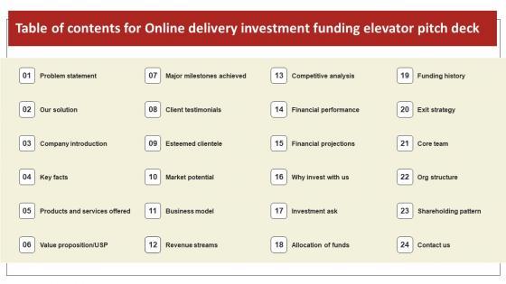 Are you searching for a Table Of Contents For Online Delivery Investment Funding Elevator Pitch Deck Themes Pdf that is uncluttered, straightforward, and original Its easy to edit, and you can change the colors to suit your personal or business branding. For a presentation that expresses how much effort you have put in, this template is ideal With all of its features, including tables, diagrams, statistics, and lists, its perfect for a business plan presentation. Make your ideas more appealing with these professional slides. Download Table Of Contents For Online Delivery Investment Funding Elevator Pitch Deck Themes Pdf from Slidegeeks today. Our Table Of Contents For Online Delivery Investment Funding Elevator Pitch Deck Themes Pdf are topically designed to provide an attractive backdrop to any subject. Use them to look like a presentation pro.