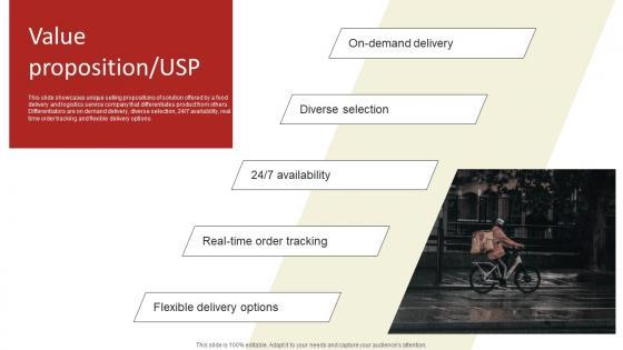 This slide showcases unique selling propositions of solution offered by a food delivery and logistics service company that differentiates product from others. Differentiators are on demand delivery, diverse selection, 24 7 availability, real time order tracking and flexible delivery options. Retrieve professionally designed Value Proposition USP Online Delivery Investment Funding Elevator Pitch Deck Introduction Pdf to effectively convey your message and captivate your listeners. Save time by selecting pre made slideshows that are appropriate for various topics, from business to educational purposes. These themes come in many different styles, from creative to corporate, and all of them are easily adjustable and can be edited quickly. Access them as PowerPoint templates or as Google Slides themes. You do not have to go on a hunt for the perfect presentation because Slidegeeks got you covered from everywhere. This slide showcases unique selling propositions of solution offered by a food delivery and logistics service company that differentiates product from others. Differentiators are on demand delivery, diverse selection, 24 7 availability, real time order tracking and flexible delivery options.