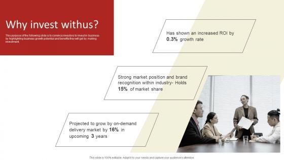 This purpose of the following slide is to convince investors to invest in business by highlighting business growth potential and benefits they will get by making investment. Slidegeeks has constructed Why Invest Withus Online Delivery Investment Funding Elevator Pitch Deck Background Pdf after conducting extensive research and examination. These presentation templates are constantly being generated and modified based on user preferences and critiques from editors. Here, you will find the most attractive templates for a range of purposes while taking into account ratings and remarks from users regarding the content. This is an excellent jumping off point to explore our content and will give new users an insight into our top notch PowerPoint Templates. This purpose of the following slide is to convince investors to invest in business by highlighting business growth potential and benefits they will get by making investment.