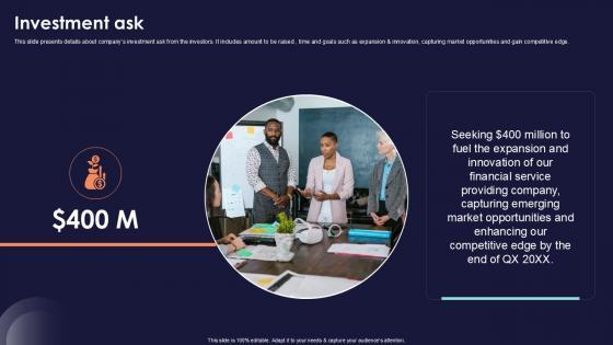This slide presents details about companys investment ask from the investors. It includes amount to be raised , time and goals such as expansion and innovation, capturing market opportunities and gain competitive edge. Find highly impressive Investment Ask Online Financial Services Platform Ppt Template on Slidegeeks to deliver a meaningful presentation. You can save an ample amount of time using these presentation templates. No need to worry to prepare everything from scratch because Slidegeeks experts have already done a huge research and work for you. You need to download Investment Ask Online Financial Services Platform Ppt Template for your upcoming presentation. All the presentation templates are 100 percent editable and you can change the color and personalize the content accordingly. Download now This slide presents details about companys investment ask from the investors. It includes amount to be raised , time and goals such as expansion and innovation, capturing market opportunities and gain competitive edge.