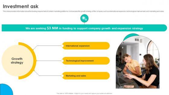 This slide provides information about the funding requirement of content marketing platforms. It showcases the growth strategy of the company such as international expansion, technological improvement, and marketing and sales. Find highly impressive Investment Ask Online Marketing Solutions Pitch Deck on Slidegeeks to deliver a meaningful presentation. You can save an ample amount of time using these presentation templates. No need to worry to prepare everything from scratch because Slidegeeks experts have already done a huge research and work for you. You need to download Investment Ask Online Marketing Solutions Pitch Deck for your upcoming presentation. All the presentation templates are 100 percent editable and you can change the color and personalize the content accordingly. Download now This slide provides information about the funding requirement of content marketing platforms. It showcases the growth strategy of the company such as international expansion, technological improvement, and marketing and sales.