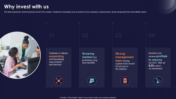This slide presents why should businesses invest in the company. It features its advantages such as product and service expansion, growing market, strong management team and profitable returns. The best PPT templates are a great way to save time, energy, and resources. Slidegeeks have 100 percent editable powerpoint slides making them incredibly versatile. With these quality presentation templates, you can create a captivating and memorable presentation by combining visually appealing slides and effectively communicating your message. Download Why Invest With Us Online Financial Services Platform Ppt Example from Slidegeeks and deliver a wonderful presentation. This slide presents why should businesses invest in the company. It features its advantages such as product and service expansion, growing market, strong management team and profitable returns.