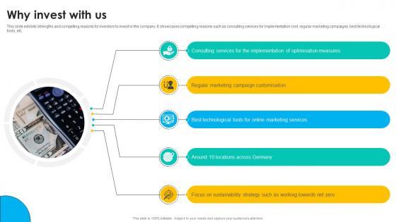 This slide exhibits strengths and compelling reasons for investors to invest in the company. It showcases compelling reasons such as consulting services for implementation cost, regular marketing campaigns, best technological tools, etc. The best PPT templates are a great way to save time, energy, and resources. Slidegeeks have 100 percent editable powerpoint slides making them incredibly versatile. With these quality presentation templates, you can create a captivating and memorable presentation by combining visually appealing slides and effectively communicating your message. Download Why Invest With Us Online Marketing Solutions Pitch Deck from Slidegeeks and deliver a wonderful presentation. This slide exhibits strengths and compelling reasons for investors to invest in the company. It showcases compelling reasons such as consulting services for implementation cost, regular marketing campaigns, best technological tools, etc.