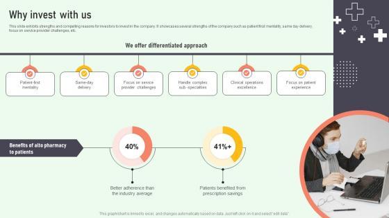 This slide exhibits strengths and compelling reasons for investors to invest in the company. It showcases several strengths of the company such as patient first mentality, same day delivery, focus on service provider challenges, etc. This Why Invest With Us Online Medication Management Platform Pitch Deck from Slidegeeks makes it easy to present information on your topic with precision. It provides customization options, so you can make changes to the colors, design, graphics, or any other component to create a unique layout. It is also available for immediate download, so you can begin using it right away. Slidegeeks has done good research to ensure that you have everything you need to make your presentation stand out. Make a name out there for a brilliant performance. This slide exhibits strengths and compelling reasons for investors to invest in the company. It showcases several strengths of the company such as patient first mentality, same day delivery, focus on service provider challenges, etc.