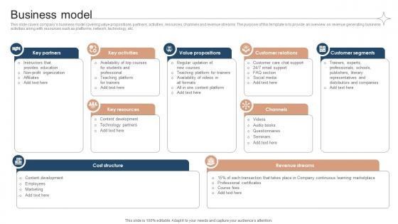 This slide covers companys business model covering value propositions, partners, activities, resources, channels and revenue streams. The purpose of this template is to provide an overview on revenue generating business activities along with resources such as platforms, network, technology, etc. Boost your pitch with our creative Business Model Investor Funding Elevator Pitch Deck For Online Learning Platform. Deliver an awe-inspiring pitch that will mesmerize everyone. Using these presentation templates you will surely catch everyones attention. You can browse the ppts collection on our website. We have researchers who are experts at creating the right content for the templates. So you do not have to invest time in any additional work. Just grab the template now and use them. This slide covers companys business model covering value propositions, partners, activities, resources, channels and revenue streams. The purpose of this template is to provide an overview on revenue generating business activities along with resources such as platforms, network, technology, etc.