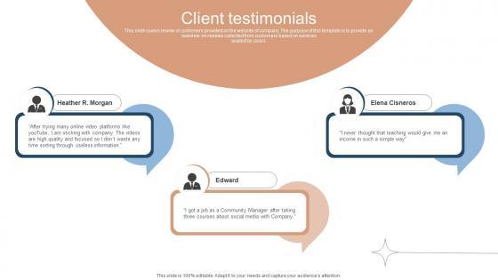 This slide covers review of customers provided on the website of company. The purpose of this template is to provide an overview on reviews collected from customers based on services availed by users. Create an editable Client Testimonials Investor Funding Elevator Pitch Deck For Online Learning Platform that communicates your idea and engages your audience. Whether you are presenting a business or an educational presentation, pre-designed presentation templates help save time. Client Testimonials Investor Funding Elevator Pitch Deck For Online Learning Platform is highly customizable and very easy to edit, covering many different styles from creative to business presentations. Slidegeeks has creative team members who have crafted amazing templates. So, go and get them without any delay. This slide covers review of customers provided on the website of company. The purpose of this template is to provide an overview on reviews collected from customers based on services availed by users.
