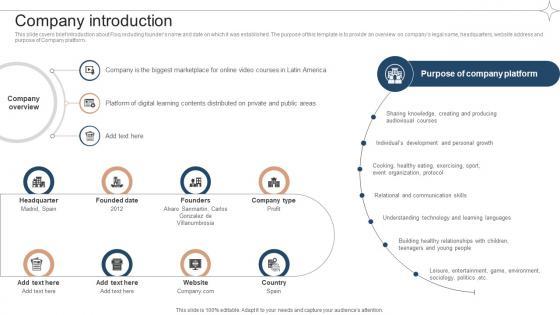This slide covers brief introduction about Floq including founders name and date on which it was established. The purpose of this template is to provide an overview on companys legal name, headquarters, website address and purpose of Company platform. Slidegeeks is one of the best resources for PowerPoint templates. You can download easily and regulate Company Introduction Investor Funding Elevator Pitch Deck For Online Learning Platform for your personal presentations from our wonderful collection. A few clicks is all it takes to discover and get the most relevant and appropriate templates. Use our Templates to add a unique zing and appeal to your presentation and meetings. All the slides are easy to edit and you can use them even for advertisement purposes. This slide covers brief introduction about Floq including founders name and date on which it was established. The purpose of this template is to provide an overview on companys legal name, headquarters, website address and purpose of Company platform.