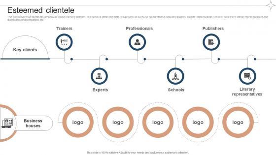 This slide covers top clients of Company as online learning platform. The purpose of this template is to provide an overview on client base including trainers, experts, professionals, schools, publishers, literary representatives and distributors and companies, etc. Get a simple yet stunning designed Esteemed Clientele Investor Funding Elevator Pitch Deck For Online Learning Platform. It is the best one to establish the tone in your meetings. It is an excellent way to make your presentations highly effective. So, download this PPT today from Slidegeeks and see the positive impacts. Our easy-to-edit Esteemed Clientele Investor Funding Elevator Pitch Deck For Online Learning Platform can be your go-to option for all upcoming conferences and meetings. So, what are you waiting for Grab this template today. This slide covers top clients of Company as online learning platform. The purpose of this template is to provide an overview on client base including trainers, experts, professionals, schools, publishers, literary representatives and distributors and companies, etc.
